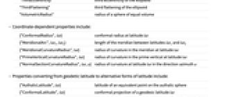 {"ConformalRadius",lat} conformal radius at latitude lat {"MeridionalArc",lat1,lat2} length of the meridian between latitudes lat1 and lat2 {"MeridionalCurvatureRadius",lat} radius of curvature in the meridian at latitude lat {"PrimeVerticalCurvatureRadius",lat} radius of curvature in the prime vertical at latitude lat {"NormalSectionCurvatureRadius",lat,a} radius of curvature at latitude lat in the direction azimuth a - Properties converting from geodetic latitude to alternative forms of latitude include:
