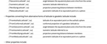 {"FromAuthalicLatitude",lat} latitude of an equivalent point on the authalic sphere {"FromConformalLatitude",lat} conformal projection of a geodesic latitude lat {"FromGeocentricLatitude",lat} angle between the equatorial plane and a line from the center {"FromIsometricLatitude",lat} isometric latitude referred to lat {"FromRectifyingLatitude",lat} projection preserving distance between meridians {"FromReducedLatitude",lat} parametric latitude of an equivalent point on a sphere - Other properties include: