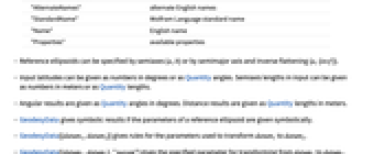 "AlternateNames" alternate English names "StandardName" Wolfram Language standard name "Name" English name "Properties" available properties - Reference ellipsoids can be specified by semiaxes {a,b} or by semimajor axis and inverse flattening {a,{invf}}.