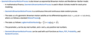 - GeometricBrownianMotionProcess is a continuous-time and continuous-state random process.