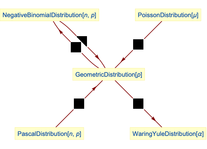 . GeometricDistribution is also a transformation of PascalDistribution and can be viewed as a parameter mixture of PoissonDistribution with either GammaDistribution or ExponentialDistribution, in the sense that both ParameterMixtureDistribution[PoissonDistribution[μ],μGammaDistribution[1,(1-p)/p]] and ParameterMixtureDistribution[PoissonDistribution[μ],μ ExponentialDistribution[p/(1-p)]] are the same as GeometricDistribution[p]. GeometricDistribution is also related to WaringYuleDistribution, BinomialDistribution, PascalDistribution, and HypergeometricDistribution.