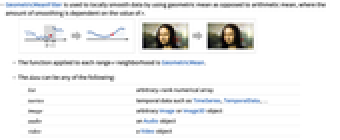 list arbitrary-rank numerical array tseries temporal data such as TimeSeries, TemporalData, … image arbitrary Image or Image3D object audio an Audio object video a Video object - For multichannel images and audio signals, GeometricMeanFilter operates separately on each channel.
