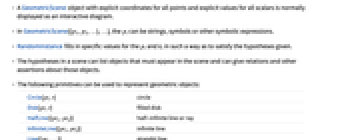 - A GeometricScene object with explicit coordinates for all points and explicit values for all scalars is normally displayed as an interactive diagram.