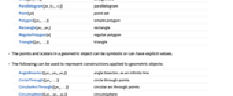 Circle[pt,r] circle Disk[pt,r] filled disk HalfLine[{pt1,pt2}] half-infinite line or ray InfiniteLine[{pt1,pt2}] infinite line Line[{pt1,…}] straight line Parallelogram[pt,{v1,v2}] parallelogram Point[pt] point set Polygon[{pt1,…}] simple polygon Rectangle[pt1,pt2] rectangle RegularPolygon[n] regular polygon Triangle[{pt1,…}] triangle - The points and scalars in a geometric object can be symbolic or can have explicit values.