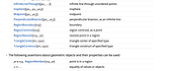 AngleBisector[{pt1,pt2,pt3}] angle bisector, as an infinite line CircleThrough[{pt1,…}] circle through points CircularArcThrough[{pt1,…}] circular arc through points Circumsphere[{pt1,pt2,pt3}] circumsphere InfiniteLineThrough[{pt1,…}] infinite line through unordered points Insphere[{pt1,pt2,pt3}] insphere Midpoint[{pt1,pt2}] midpoint PerpendicularBisector[{pt1,pt2}] perpendicular bisector, as an infinite line RegionBoundary[reg] boundary RegionCentroid[reg] region centroid, as a point RegionNearest[reg, pt] nearest point in a region TriangleCenter[tri,type] triangle center of specified type TriangleConstruct[tri,type] triangle construct of specified type - The following assertions about geometric objects and their properties can be used: