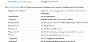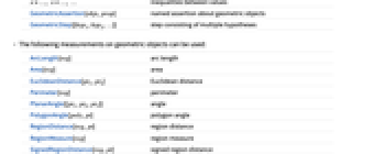 pt∈reg, RegionMember[reg,pt] point is in a region x… equality of values or objects x>…, x<…, … inequalities between values GeometricAssertion[objs,prop] named assertion about geometric objects GeometricStep[{hyp1,hyp2,…}] step consisting of multiple hypotheses - The following measurements on geometric objects can be used: