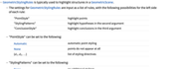 None no additional stylings {p1d1,p2d2,…} use styling directives di for structures pi - In the list of styling rules, the pi may be any pattern that matches a geometric structure as it is entered in the GeometricScene, and the di may be any list of styling directives.