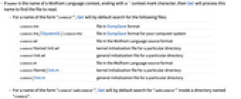 context.mx file in DumpSave format context.mx/$SystemID/context.mx file in DumpSave format for your computer system context.wl file in the Wolfram Language source format context/Kernel/init.wl kernel initialization file for a particular directory context/init.wl general initialization file for a particular directory context.m file in the Wolfram Language source format context/Kernel/init.m kernel initialization file for a particular directory context/init.m general initialization file for a particular directory - For a name of the form "context`subcontext`", Get will by default search for "subcontext`" inside a directory named "context".
