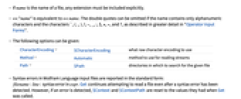 CharacterEncoding $CharacterEncoding what raw character encoding to use Method Automatic method to use for reading streams Path $Path directories in which to search for the given file - Syntax errors in Wolfram Language input files are reported in the standard form: filename: line: syntax error in expr. Get continues attempting to read a file even after a syntax error has been detected. However, if an error is detected, $Context and $ContextPath are reset to the values they had when Get was called.