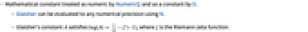 expansion are equally distributed) to any base. - Glaisher can be evaluated to arbitrary numerical precision using N. However, no efficient formulas for computing large numbers of its digits are currently known. RealDigits can be used to return a list of digits of Glaisher and ContinuedFraction to obtain terms of its continued fraction expansion.