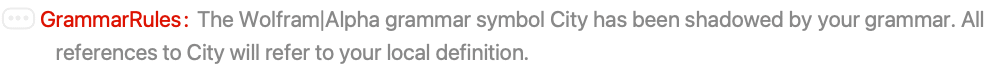The replacement for GrammarToken["City"] prevents use of the usual one by this grammar: