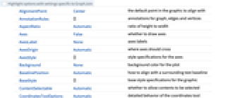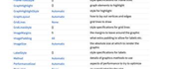 AlignmentPoint Center the default point in the graphic to align with AnnotationRules {} annotations for graph, edges and vertices AspectRatio Automatic ratio of height to width Axes False whether to draw axes AxesLabel None axes labels AxesOrigin Automatic where axes should cross AxesStyle {} style specifications for the axes Background None background color for the plot BaselinePosition Automatic how to align with a surrounding text baseline BaseStyle {} base style specifications for the graphic ContentSelectable Automatic whether to allow contents to be selected CoordinatesToolOptions Automatic detailed behavior of the coordinates tool DirectedEdges Automatic whether to interpret Rule as DirectedEdge EdgeLabels None labels and label placements for edges EdgeLabelStyle Automatic style to use for edge labels EdgeShapeFunction Automatic generate graphic shapes for edges EdgeStyle Automatic style used for edges EdgeWeight Automatic weights for edges Epilog {} primitives rendered after the main plot FormatType TraditionalForm the default format type for text Frame False whether to put a frame around the plot FrameLabel None frame labels FrameStyle {} style specifications for the frame FrameTicks Automatic frame ticks FrameTicksStyle {} style specifications for frame ticks GraphHighlight {} graph elements to highlight GraphHighlightStyle Automatic style for highlight GraphLayout Automatic how to lay out vertices and edges GridLines None grid lines to draw GridLinesStyle {} style specifications for grid lines ImageMargins 0. the margins to leave around the graphic ImagePadding All what extra padding to allow for labels etc. ImageSize Automatic the absolute size at which to render the graphic LabelStyle {} style specifications for labels Method Automatic details of graphics methods to use PerformanceGoal Automatic aspects of performance to try to optimize PlotLabel None an overall label for the plot PlotRange All range of values to include PlotRangeClipping False whether to clip at the plot range PlotRangePadding Automatic how much to pad the range of values PlotRegion Automatic the final display region to be filled PlotTheme $PlotTheme overall theme for the graph PreserveImageOptions Automatic whether to preserve image options when displaying new versions of the same graphic Prolog {} primitives rendered before the main plot RotateLabel True whether to rotate y labels on the frame Ticks Automatic axes ticks TicksStyle {} style specifications for axes ticks VertexCoordinates Automatic coordinates for vertices VertexLabels None labels and placements for vertices VertexLabelStyle Automatic style to use for vertex labels VertexShape Automatic graphic shape for vertices VertexShapeFunction Automatic generate graphic shapes for vertices VertexSize Medium size of vertices VertexStyle Automatic styles for vertices VertexWeight Automatic weights for vertices