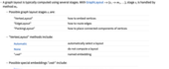 - A graph layout is typically computed using several stages. With GraphLayout->{s1->m1,…}, stage si is handled by method mi.