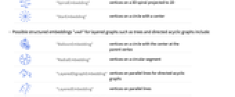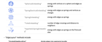 "VertexLayout" how to embed vertices "EdgeLayout" how to route edges "PackingLayout" how to place connected components of vertices - "VertexLayout" methods include: