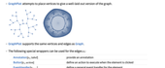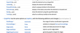 Annotation[ei,label] provide an annotation Button[ei,action] define an action to execute when the element is clicked EventHandler[ei,…] define a general event handler for the element Hyperlink[ei,uri] make the element act as a hyperlink Labeled[ei,…] display the element with labeling PopupWindow[ei,cont] attach a popup window to the element StatusArea[ei,label] display in the status area when the element is moused over Style[ei,opts] show the element using the specified styles Tooltip[ei,label] attach an arbitrary tooltip to the element - GraphPlot has the same options as Graphics, with the following additions and changes: [List of all options]