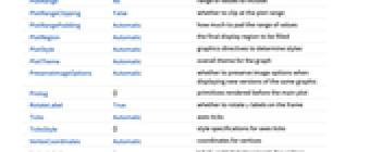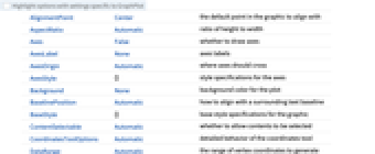 AlignmentPoint Center the default point in the graphic to align with AspectRatio Automatic ratio of height to width Axes False whether to draw axes AxesLabel None axes labels AxesOrigin Automatic where axes should cross AxesStyle {} style specifications for the axes Background None background color for the plot BaselinePosition Automatic how to align with a surrounding text baseline BaseStyle {} base style specifications for the graphic ContentSelectable Automatic whether to allow contents to be selected CoordinatesToolOptions Automatic detailed behavior of the coordinates tool DataRange Automatic the range of vertex coordinates to generate DirectedEdges False whether to interpret Rule as DirectedEdge EdgeLabels None labels and label placements for edges EdgeLabelStyle Automatic style to use for edge labels EdgeShapeFunction Automatic generate graphic shapes for edges EdgeStyle Automatic styles for edges Epilog {} primitives rendered after the main plot FormatType TraditionalForm the default format type for text Frame False whether to put a frame around the plot FrameLabel None frame labels FrameStyle {} style specifications for the frame FrameTicks Automatic frame ticks FrameTicksStyle {} style specifications for frame ticks GraphHighlight {} vertices and edges to highlight GraphHighlightStyle Automatic style for highlight GraphLayout Automatic how to lay out vertices and edges GridLines None grid lines to draw GridLinesStyle {} style specifications for grid lines ImageMargins 0. the margins to leave around the graphic ImagePadding All what extra padding to allow for labels etc. ImageSize Automatic the absolute size at which to render the graphic LabelStyle {} style specifications for labels Method Automatic method to use PerformanceGoal Automatic aspects of performance to try to optimize PlotLabel None an overall label for the plot PlotRange All range of values to include PlotRangeClipping False whether to clip at the plot range PlotRangePadding Automatic how much to pad the range of values PlotRegion Automatic the final display region to be filled PlotStyle Automatic graphics directives to determine styles PlotTheme Automatic overall theme for the graph PreserveImageOptions Automatic whether to preserve image options when displaying new versions of the same graphic Prolog {} primitives rendered before the main plot RotateLabel True whether to rotate y labels on the frame Ticks Automatic axes ticks TicksStyle {} style specifications for axes ticks VertexCoordinates Automatic coordinates for vertices VertexLabels None labels and label placements for vertices VertexLabelStyle Automatic style to use for vertex labels VertexShape Automatic graphic shape for vertices VertexShapeFunction Automatic generate graphic shapes for vertices VertexSize Automatic size of vertices VertexStyle Automatic styles for vertices