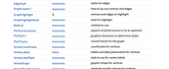 DataRange Automatic the range of vertex coordinates to generate DirectedEdges False whether to interpret Rule as DirectedEdge EdgeLabels None labels and label placements for edges EdgeLabelStyle Automatic style to use for edge labels EdgeShapeFunction Automatic generate graphic shapes for edges EdgeStyle Automatic styles for edges GraphLayout Automatic how to lay out vertices and edges GraphHighlight {} vertices and edges to highlight GraphHighlightStyle Automatic style for highlight Method Automatic method to use PerformanceGoal Automatic aspects of performance to try to optimize PlotStyle Automatic graphics directives to determine styles PlotTheme Automatic overall theme for the graph VertexCoordinates Automatic coordinates for vertices VertexLabels None labels and label placements for vertices VertexLabelStyle Automatic style to use for vertex labels VertexShape Automatic graphic shape for vertices VertexShapeFunction Automatic generate graphic shapes for vertices VertexSize Automatic size of vertices VertexStyle Automatic styles for vertices - With the setting VertexCoordinates->Automatic, the embedding of vertices and routing of edges is computed automatically, based on the setting for GraphLayout.