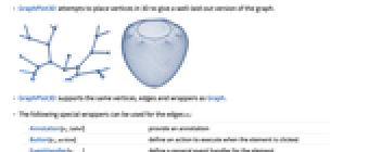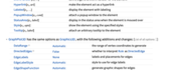 Annotation[ei,label] provide an annotation Button[ei,action] define an action to execute when the element is clicked EventHandler[ei,…] define a general event handler for the element Hyperlink[ei,uri] make the element act as a hyperlink Labeled[ei,…] display the element with labeling PopupWindow[ei,cont] attach a popup window to the element StatusArea[ei,label] display in the status area when the element is moused over Style[ei,opts] show the element using the specified styles Tooltip[ei,label] attach an arbitrary tooltip to the element - GraphPlot3D has the same options as Graphics3D, with the following additions and changes: [List of all options]