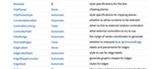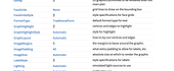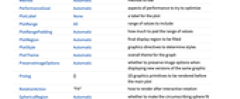 AlignmentPoint Center the default point in the graphic to align with AspectRatio Automatic ratio of height to width Axes False whether to draw axes AxesEdge Automatic on which edges to put axes AxesLabel None axes labels AxesOrigin Automatic where axes should cross AxesStyle {} graphics directives to specify the style for axes Background None background color for the plot BaselinePosition Automatic how to align with a surrounding text baseline BaseStyle {} base style specifications for the graphic Boxed True whether to draw the bounding box BoxRatios Automatic bounding 3D box ratios BoxStyle {} style specifications for the box ClipPlanes None clipping planes ClipPlanesStyle Automatic style specifications for clipping planes ContentSelectable Automatic whether to allow contents to be selected ControllerLinking False when to link to external rotation controllers ControllerPath Automatic what external controllers to try to use DataRange Automatic the range of vertex coordinates to generate DirectedEdges False whether to interpret Rule as DirectedEdge EdgeLabels None labels and placements for edges EdgeLabelStyle Automatic style to use for edge labels EdgeShapeFunction Automatic generate graphic shapes for edges EdgeStyle Automatic styles for edges Epilog {} 2D graphics primitives to be rendered after the main plot FaceGrids None grid lines to draw on the bounding box FaceGridsStyle {} style specifications for face grids FormatType TraditionalForm default format type for text GraphHighlight {} vertices and edges to highlight GraphHighlightStyle Automatic style for highlight GraphLayout Automatic how to lay out vertices and edges ImageMargins 0. the margins to leave around the graphic ImagePadding All what extra padding to allow for labels, etc. ImageSize Automatic absolute size at which to render the graphic LabelStyle {} style specifications for labels Lighting Automatic simulated light sources to use Method Automatic method to use PerformanceGoal Automatic aspects of performance to try to optimize PlotLabel None a label for the plot PlotRange All range of values to include PlotRangePadding Automatic how much to pad the range of values PlotRegion Automatic final display region to be filled PlotStyle Automatic graphics directives to determine styles PlotTheme Automatic overall theme for the graph PreserveImageOptions Automatic whether to preserve image options when displaying new versions of the same graphic Prolog {} 2D graphics primitives to be rendered before the main plot RotationAction "Fit" how to render after interactive rotation SphericalRegion Automatic whether to make the circumscribing sphere fit in the final display area Ticks Automatic specification for ticks TicksStyle {} style specification for ticks TouchscreenAutoZoom False whether to zoom to fullscreen when activated on a touchscreen VertexCoordinates Automatic coordinates for vertices VertexLabels None labels and placements for vertices VertexLabelStyle Automatic style to use for vertex labels VertexShape Automatic graphic shape for vertices VertexShapeFunction Automatic generate graphic shapes for vertices VertexSize Automatic size of vertices VertexStyle Automatic styles for vertices ViewAngle Automatic angle of the field of view ViewCenter Automatic point to display at the center ViewMatrix Automatic explicit transformation matrix ViewPoint {1.3,-2.4,2.} viewing position ViewProjection Automatic projection method for rendering objects distant from the viewer ViewRange All range of viewing distances to include ViewVector Automatic position and direction of a simulated camera ViewVertical {0,0,1} direction to make vertical