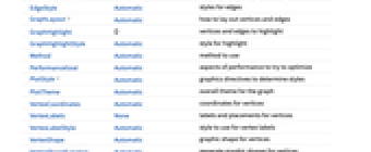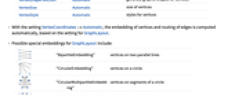 DataRange Automatic the range of vertex coordinates to generate DirectedEdges False whether to interpret Rule as DirectedEdge EdgeLabels None labels and placements for edges EdgeLabelStyle Automatic style to use for edge labels EdgeShapeFunction Automatic generate graphic shapes for edges EdgeStyle Automatic styles for edges GraphLayout Automatic how to lay out vertices and edges GraphHighlight {} vertices and edges to highlight GraphHighlightStyle Automatic style for highlight Method Automatic method to use PerformanceGoal Automatic aspects of performance to try to optimize PlotStyle Automatic graphics directives to determine styles PlotTheme Automatic overall theme for the graph VertexCoordinates Automatic coordinates for vertices VertexLabels None labels and placements for vertices VertexLabelStyle Automatic style to use for vertex labels VertexShape Automatic graphic shape for vertices VertexShapeFunction Automatic generate graphic shapes for vertices VertexSize Automatic size of vertices VertexStyle Automatic styles for vertices - With the setting VertexCoordinates->Automatic, the embedding of vertices and routing of edges is computed automatically, based on the setting for GraphLayout.