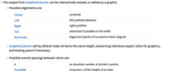Center centered Left left justified (default) Right right justified Full stretched if possible to full width Automatic alignment points of successive items aligned - GraphicsColumn will by default make all items the same height, preserving individual aspect ratios for graphics, and leaving space if necessary.