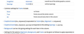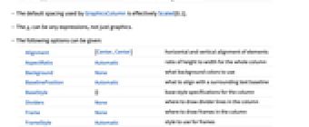 Alignment {Center,Center} horizontal and vertical alignment of elements AspectRatio Automatic ratio of height to width for the whole column Background None what background colors to use BaselinePosition Automatic what to align with a surrounding text baseline BaseStyle {} base style specifications for the column Dividers None where to draw divider lines in the column Frame None where to draw frames in the column FrameStyle Automatic style to use for frames ImageSize Automatic overall size of the whole graphics column Spacings Scaled[0.1] vertical spacings - Common settings for Frame include: