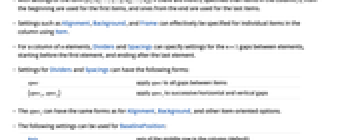 - For a column of n elements, Dividers and Spacings can specify settings for the n+1 gaps between elements, starting before the first element, and ending after the last element.