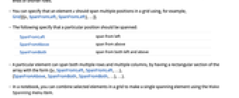 - You can specify that an element e should span multiple positions in a grid using, for example, Grid[{{e,SpanFromLeft,SpanFromLeft},…}].