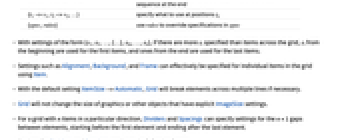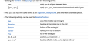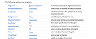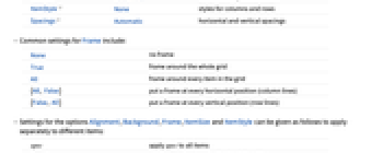 Alignment {Center,Baseline} horizontal and vertical alignment of items AllowedDimensions Automatic restrictions on number of rows or columns AutoDelete False whether to remove the grid structure if only one item remains Background None what background colors to use BaselinePosition Automatic what to align with a surrounding text baseline BaseStyle {} base style specifications for the grid DefaultElement "" what element to insert in an empty item Dividers {} where to draw divider lines in the grid Frame None where to draw frames in the grid FrameStyle Automatic style to use for frames ItemSize Automatic width and height of each item ItemStyle None styles for columns and rows Spacings Automatic horizontal and vertical spacings - Common settings for Frame include: