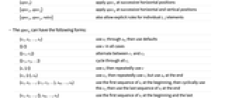 {s1,s2,…,sn} use s1 through sn, then use defaults {{c}} use c in all cases {{c1,c2}} alternate between c1 and c2 {{c1,c2,…}} cycle through all ci {s,{c}} use s, then repeatedly use c {s1,{c},sn} use s1, then repeatedly use c, but use sn at the end {s1,s2,…,{c1,c2,…},sm,…,sn} use the first sequence of si at the beginning, then cyclically use the ci, then use the last sequence of si at the end {s1,s2,…,{},sm,…,sn} use the first sequence of si at the beginning and the last sequence at the end {i1->v1,i2->v2,…} specify what to use at positions ik {spec,rules} use rules to override specifications in spec - With settings of the form {s1,s2,…,{…},sm,…,sn}, if there are more si specified than items across the grid, si from the beginning are used for the first items, and ones from the end are used for the last items.