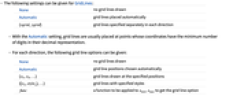 None no grid lines drawn Automatic grid lines placed automatically {xgrid,ygrid} grid lines specified separately in each direction - With the Automatic setting, grid lines are usually placed at points whose coordinates have the minimum number of digits in their decimal representation.