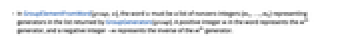 - In GroupElementFromWord[group,w], the word w must be a list of nonzero integers {m1,…,mk} representing generators in the list returned by GroupGenerators[group]. A positive integer