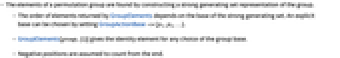 - The order of elements returned by GroupElements depends on the base of the strong generating set. An explicit base can be chosen by setting GroupActionBase->{p1,p2,…}.