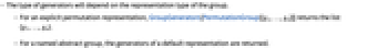 - For an explicit permutation representation, GroupGenerators[PermutationGroup[{g1,…,gn}]] returns the list {g1,…,gn}.