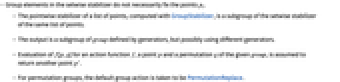 - Evaluation of f[p,g] for an action function f, a point p and a permutation g of the given group, is assumed to return another point p'.