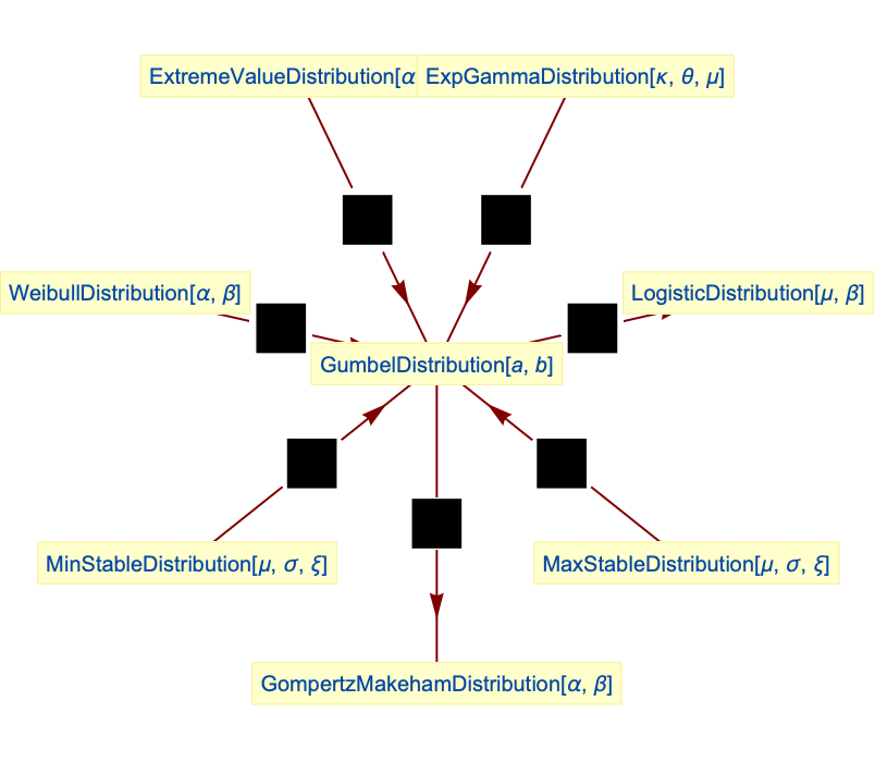 - The Gumbel distribution is related to several other distributions. As mentioned previously, GumbelDistribution shares qualitative relationships with ExtremeValueDistribution, FrechetDistribution, and WeibullDistribution. These relationships can be quantified by noting that the PDF of GumbelDistribution[α,β] is precisely the same as that of both TransformedDistribution[-u,u ExtremeValueDistribution[-α,β]] and TransformedDistribution[β α Log[u/β]+α,u WeibullDistribution[α,β]], and that FrechetDistribution is a transformed WeibullDistribution. GumbelDistribution is related to MinStableDistribution and MaxStableDistribution, in the sense that the PDF of GumbelDistribution[α,β], MinStableDistribution[α,β,0], and TransformedDistribution[-u,u MaxStableDistribution[-α,β,0]] are all the same. GumbelDistribution is also related to LogisticDistribution, ExpGammaDistribution, GompertzMakehamDistribution, and ExponentialDistribution.