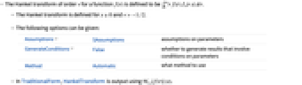 Assumptions $Assumptions assumptions on parameters GenerateConditions False whether to generate results that involve conditions on parameters Method Automatic what method to use - In TraditionalForm, HankelTransform is output using