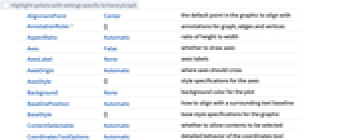 AlignmentPoint Center the default point in the graphic to align with AnnotationRules {} annotations for graph, edges and vertices AspectRatio Automatic ratio of height to width Axes False whether to draw axes AxesLabel None axes labels AxesOrigin Automatic where axes should cross AxesStyle {} style specifications for the axes Background None background color for the plot BaselinePosition Automatic how to align with a surrounding text baseline BaseStyle {} base style specifications for the graphic ContentSelectable Automatic whether to allow contents to be selected CoordinatesToolOptions Automatic detailed behavior of the coordinates tool DirectedEdges Automatic whether to interpret Rule as DirectedEdge EdgeLabels None labels and label placements for edges EdgeLabelStyle Automatic style to use for edge labels EdgeShapeFunction Automatic generate graphic shapes for edges EdgeStyle Automatic style used for edges EdgeWeight Automatic weights for edges Epilog {} primitives rendered after the main plot FormatType TraditionalForm the default format type for text Frame False whether to put a frame around the plot FrameLabel None frame labels FrameStyle {} style specifications for the frame FrameTicks Automatic frame ticks FrameTicksStyle {} style specifications for frame ticks GraphHighlight {} graph elements to highlight GraphHighlightStyle Automatic style for highlight GraphLayout Automatic how to lay out vertices and edges GridLines None grid lines to draw GridLinesStyle {} style specifications for grid lines ImageMargins 0. the margins to leave around the graphic ImagePadding All what extra padding to allow for labels etc. ImageSize Automatic the absolute size at which to render the graphic LabelStyle {} style specifications for labels Method Automatic details of graphics methods to use PerformanceGoal Automatic aspects of performance to try to optimize PlotLabel None an overall label for the plot PlotRange All range of values to include PlotRangeClipping False whether to clip at the plot range PlotRangePadding Automatic how much to pad the range of values PlotRegion Automatic the final display region to be filled PlotTheme $PlotTheme overall theme for the graph PreserveImageOptions Automatic whether to preserve image options when displaying new versions of the same graphic Prolog {} primitives rendered before the main plot RotateLabel True whether to rotate y labels on the frame Ticks Automatic axes ticks TicksStyle {} style specifications for axes ticks VertexCoordinates Automatic coordinates for vertices VertexLabels None labels and placements for vertices VertexLabelStyle Automatic style to use for vertex labels VertexShape Automatic graphic shape for vertices VertexShapeFunction Automatic generate graphic shapes for vertices VertexSize Medium size of vertices VertexStyle Automatic styles for vertices VertexWeight Automatic weights for vertices