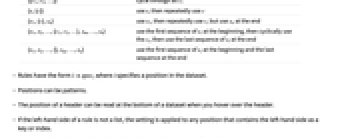 {s1,s2,…,sn} use s1 through sn; then use defaults {{c}} use c in all cases {{c1,c2}} alternate between c1 and c2 {{c1,c2,…}} cycle through all ci {s,{c}} use s, then repeatedly use c {s1,{c},sn} use s1, then repeatedly use c, but use sn at the end {s1,s2,…,{c1,c2,…},sm,…,sn} use the first sequence of si at the beginning, then cyclically use the ci, then use the last sequence of si at the end {s1,s2,…,{},sm,…,sn} use the first sequence of si at the beginning and the last sequence at the end - Rules have the form ispec, where i specifies a position in the dataset.