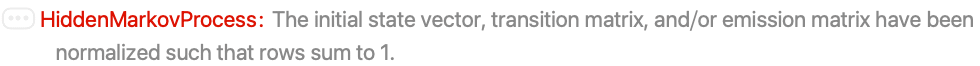 of non-negative elements that sum to 1. - HiddenMarkovProcess can be used with such functions as LogLikelihood, FindHiddenMarkovStates, EstimatedProcess, PDF, Probability, and RandomFunction.