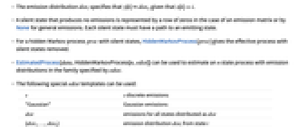 - The emission matrix em specifies the probabilities for emissions at a given hidden state em〚i,r〛Probability[y[k]rx[k]i], where x[k] is the hidden state and y[k] is the emission at time k.