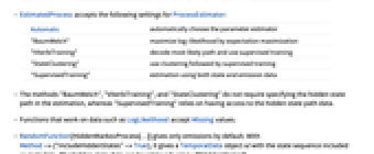 Automatic automatically choose the parameter estimator "BaumWelch" maximize log-likelihood by expectation maximization "ViterbiTraining" decode most likely path and use supervised training "StateClustering" use clustering followed by supervised training "SupervisedTraining" estimation using both state and emission data - The methods "BaumWelch", "ViterbiTraining", and "StateClustering" do not require specifying the hidden state path in the estimation, whereas "SupervisedTraining" relies on having access to the hidden state path data.