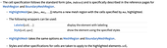 Labeled[cell,…] display the element with labeling Style[cell,spec] show the element using the specified styles - HighlightMesh takes the same options as MeshRegion and BoundaryMeshRegion.