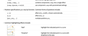 "name" use a named highlighting effect {comp1,comp2,…} combine components compi into a single effect {comp,<|param1val1|>} use component comp with parametrized settings - Position specifications pos vary by function. Common forms of positions include: