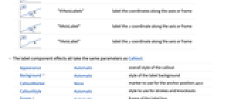 Appearance Automatic overall style of the callout Background Automatic style of the label background CalloutMarker None marker to use for the anchor position apos CalloutStyle Automatic style to use for strokes and knockouts Frame Automatic frame of the label box FrameMargins Automatic margins to leave inside the frame LabelStyle {} style to use for the label LeaderSize Automatic length and angle to use for the leader RoundingRadius 0 radius for rounded corners - Applicable highlighting effects vary by function and environment and are documented for each function.