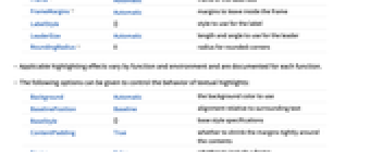 Background Automatic the background color to use BaselinePosition Baseline alignment relative to surrounding text BaseStyle {} base style specifications ContentPadding True whether to shrink the margins tightly around the contents Frame False whether to include a frame FrameMargins Automatic margins to leave inside the frame FrameStyle Automatic graphics directives giving a style for the frame ImageMargins 0 margins around the image of the displayed frame ImageSize Automatic the overall image size of the displayed frame RoundingRadius Automatic radius for rounded corners StripOnInput False whether to strip the Highlighted wrapper when the tyepset form is used as input - By default, the typeset form of Highlighted[expr] evaluates to itself, including the Highlighted head. With the option StripOnInputTrue, the typeset form evaluates to expr without the Highlighted head. »