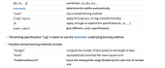 n use n bins {w} use bins of width w {min,max,w} use bins of width w from min to max {{b1,b2,…}} use bins [b1,b2),[b2,b3),… Automatic determine bin widths automatically "name" use a named binning method {"Log",bspec} apply binning bspec on log-transformed data fb apply fb to get an explicit bin specification {b1,b2,…} {xspec,yspec} give different x and y specifications - The binning specification "Log" is taken to use the Automatic underlying binning method.