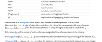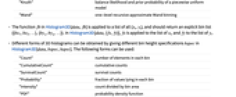 "Count" number of elements in each bin "CumulativeCount" cumulative counts "SurvivalCount" survival counts "Probability" fraction of values lying in each bin "Intensity" count divided by bin area "PDF" probability density function "CDF" cumulative distribution function "SF" survival function "HF" hazard function "CHF" cumulative hazard function {"Log",hspec} log-transformed height specification fh heights obtained by applying fh to bins and counts - The function fh in Histogram3D[data,bspec,fh] is applied to three arguments: a list of