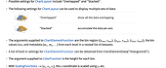 Axes True whether to draw axes BarOrigin Bottom origin of histogram bars BoxRatios {1,1,0.4} bounding 3D box ratios ChartBaseStyle Automatic overall style for bars ChartElementFunction Automatic how to generate raw graphics for bars ChartElements Automatic graphics to use in each of the bars ChartLabels None category labels for datasets ChartLayout Automatic overall layout to use ChartLegends None legends for data elements and datasets ChartStyle Automatic style for bars ColorFunction Automatic how to color bars ColorFunctionScaling True whether to normalize arguments to ColorFunction LabelingFunction Automatic how to label elements LegendAppearance Automatic overall appearance of legends Lighting "Neutral" simulated light sources to use Method Automatic methods to use PerformanceGoal $PerformanceGoal aspects of performance to try to optimize PlotInteractivity $PlotInteractivity whether to allow interactive elements PlotTheme $PlotTheme overall theme for the plot ScalingFunctions None how to scale individual coordinates TargetUnits Automatic units to display in the chart - Possible settings for ChartLayout include "Overlapped" and "Stacked".