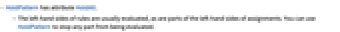 - The left‐hand sides of rules are usually evaluated, as are parts of the left‐hand sides of assignments. You can use HoldPattern to stop any part from being evaluated.